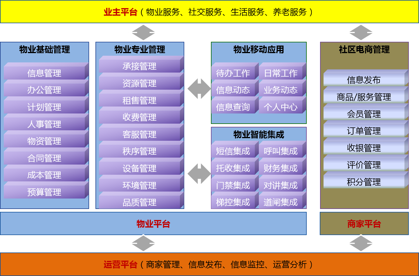 所有系统均部署在云平台或IDC中心,客户端只需可上网的电脑或手机即可,部署、维护简便,数据、信息安全,使用、运维成本较低,并且非常有利于系统集成及面向业主的应用扩展。