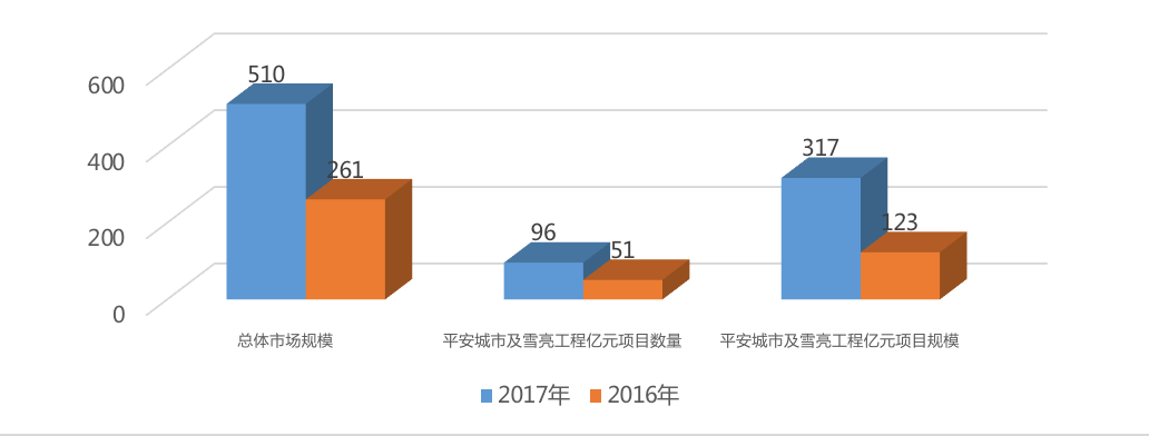 据ca88官网登录平台监测到的大项目数据显示,截止201712月底,我国城市视频监控市场中标的大项目累计有1049个,总市场规模达510亿元,较2016年市场规模增长95%。其中包含平安城市和雪亮工程在内的中标过亿元项目有96个,累计市场规模约317亿元;2016年包含平安城市和雪亮工程在内的中标过亿元项目有51项,累计市场规模约123亿元。2017年项目数量较2016年增长88%,市场规模增长158%。其中涉及雪亮工程市场规模约有的中标亿元项目9个,累计市场规模约32亿元。(PS:大项目是指中标金额≧500万元的项目)