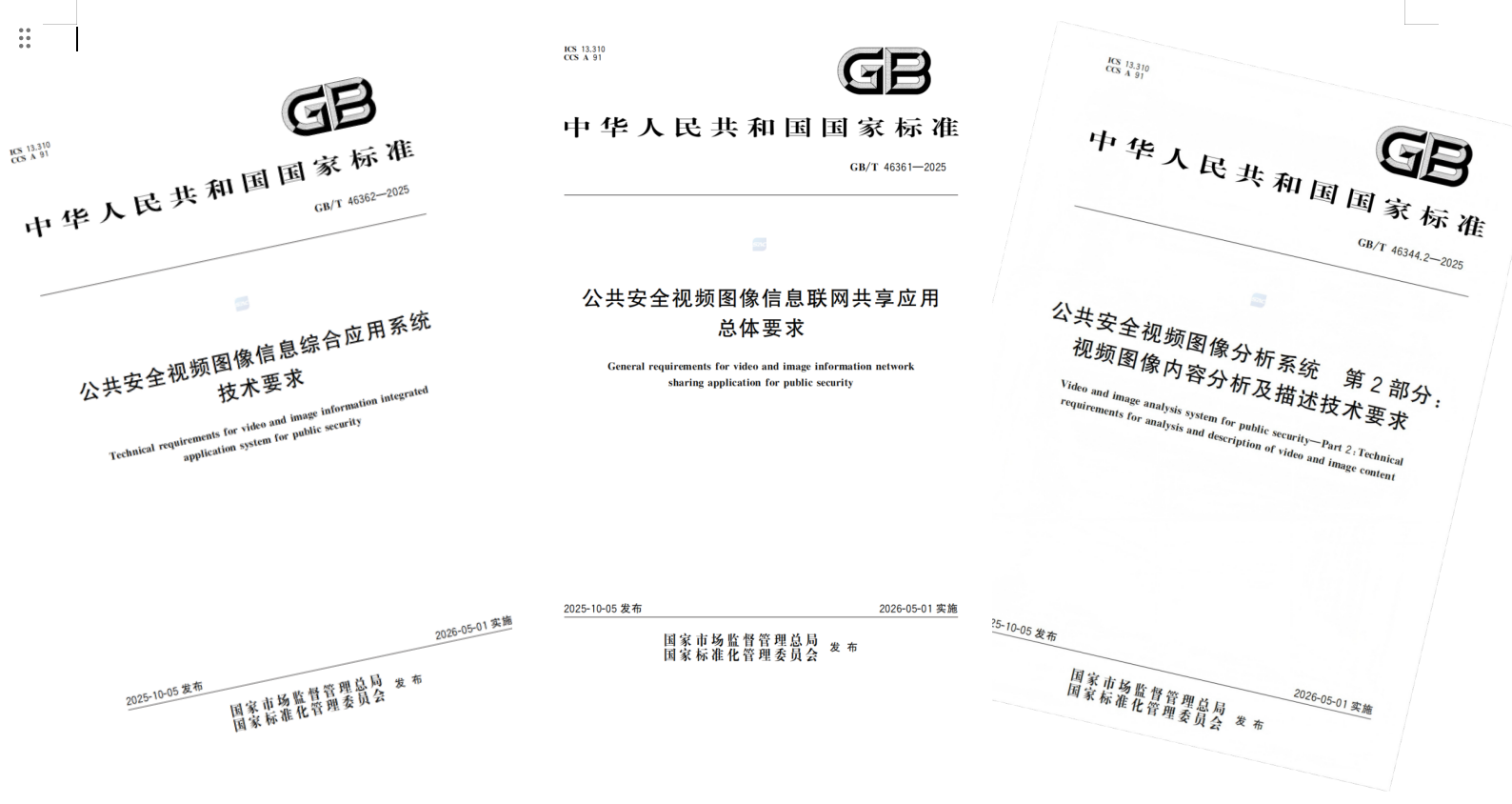近期,国家市场监督管理总局(国家标准化管理委员会)发布2025年第24号标准发布公告,批准15项公共安全视频图像国家标准正式发布。这些标准由公安部主管,全国安全防范报警系统标准化技术委员会(SAC/TC100)归口,并将于2026年5月1日正式施行。其中,ca88官网登录平台电子信息机器有限公司作为国家标准参编单位参与编制的三项国标,即GB/T46361 - 2025《公共安全视频图像信息联网共享应用总体要求》、GB/T46362 - 2025《公共安全视频图像信息综合应用系技术要求》、GB/T46344 - 2025《公共安全视频图像分析系统第2部分:视频图像内容分析及描述技术要求》,均在获批之列。